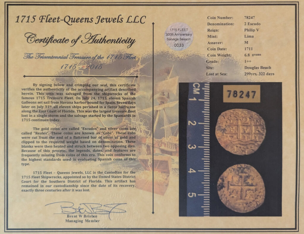 Our featured treasure has a full weight of 6.8 grams and an NGC grade of MS 63. This coin is further distinguished by the fact that it was part of the Tricentennial Treasure of the 1715 Fleet. In June 2015, a large group of gold coins (estimated at approximately 100) was recovered at the Douglass Beach wreckA 1715 Fleet wreck site located a few miles south of the Fort Pierce Inlet. It is often referred to by its old name, “Colored Beach.” In some early Real Eight Company correspondence, it was referr... More site by the Schmitt family, who were subcontractors of 1715 Fleet — Queens Jewels, LLC. This was just a month before the 300 th anniversary of the loss of the 1715 Fleet on July 31 (specifically 299 years and 322 days). Quite remarkable!