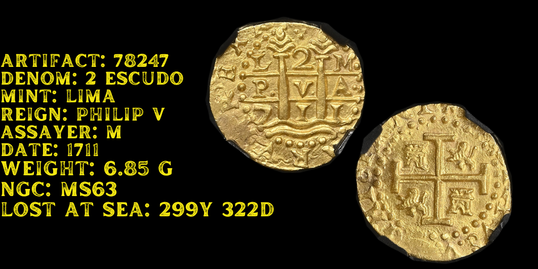 Our featured treasure has a full weight of 6.8 grams and an NGC grade of MS 63. This coin is further distinguished by the fact that it was part of the Tricentennial Treasure of the 1715 Fleet. In June 2015, a large group of gold coins (estimated at approximately 100) was recovered at the Douglass Beach wreckA 1715 Fleet wreck site located a few miles south of the Fort Pierce Inlet. It is often referred to by its old name, “Colored Beach.” In some early Real Eight Company correspondence, it was referr... More site by the Schmitt family, who were subcontractors of 1715 Fleet — Queens Jewels, LLC. This was just a month before the 300 th anniversary of the loss of the 1715 Fleet on July 31 (specifically 299 years and 322 days). Quite remarkable!
