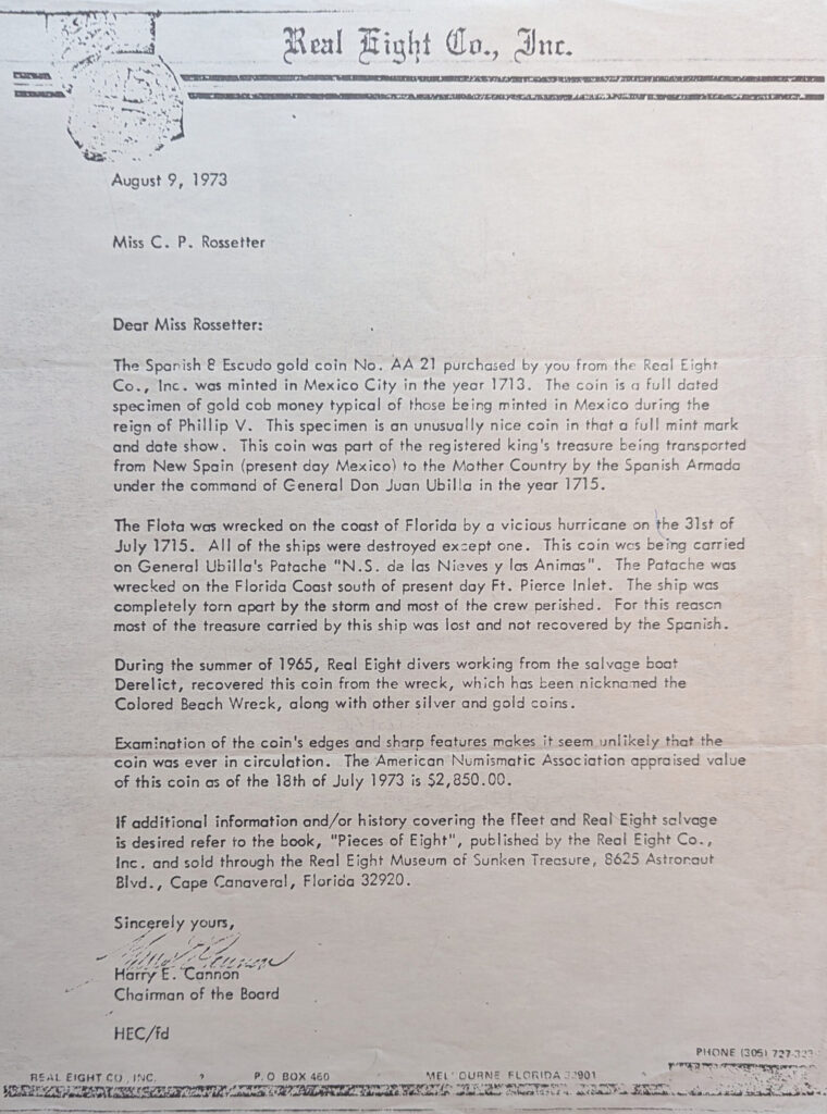 In the late 1960s, Miss Rossetter purchased an eight escudos gold coin from the Real Eight Company. The coin was minted in Mexico City and was dated 1713. It had a full mint mark and date visible. According to inventory records held by the Real Eight Company, the coin was number AA21.