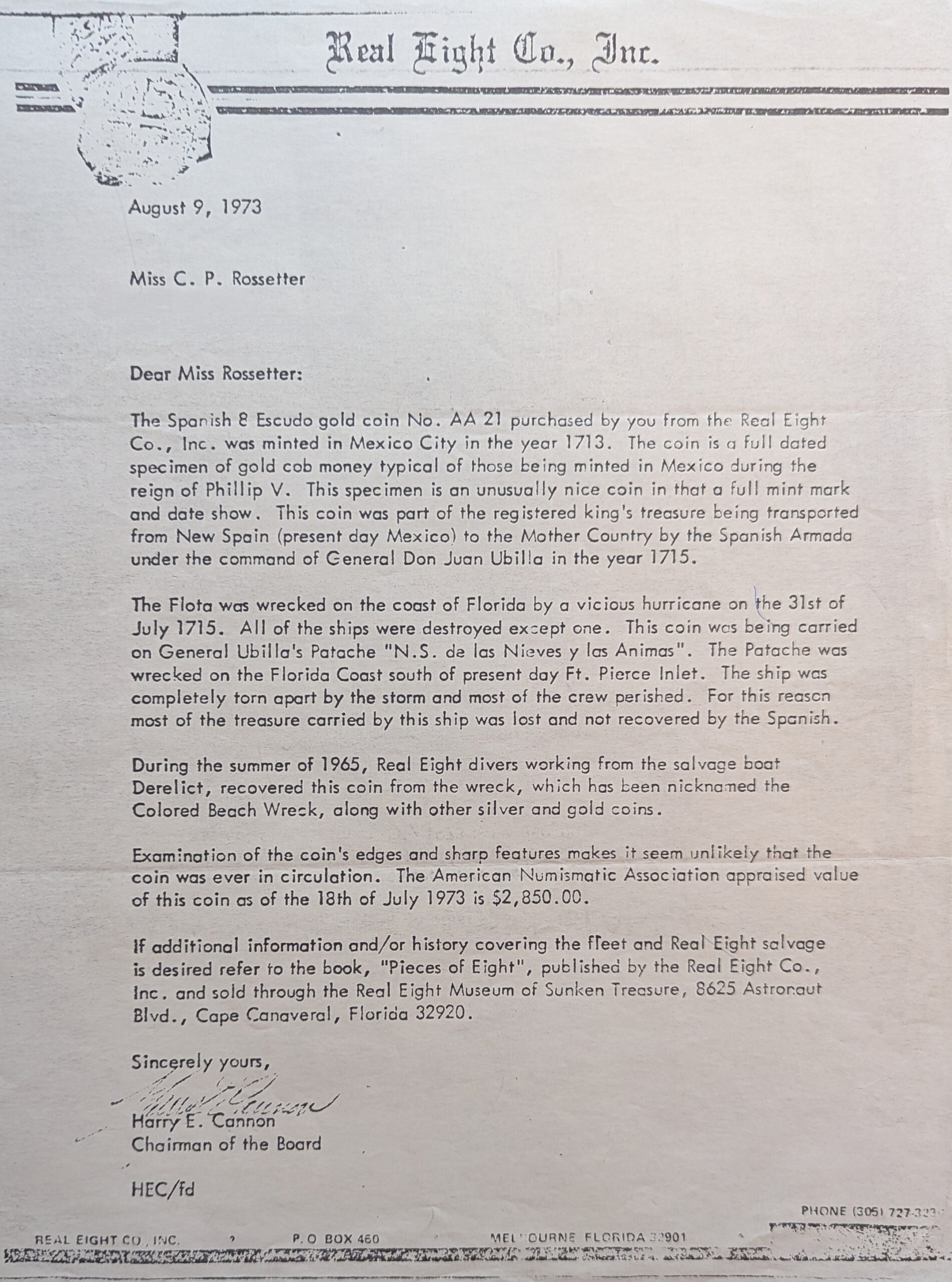 The letter (below) from Harry E. Cannon, Chairman of the Board for the Real Eight Company, indicates that as of July 18, 1973, the coin was appraised at $2,850. The letter written by Harry E. Cannon was sent to Miss Rossetter at her request.
