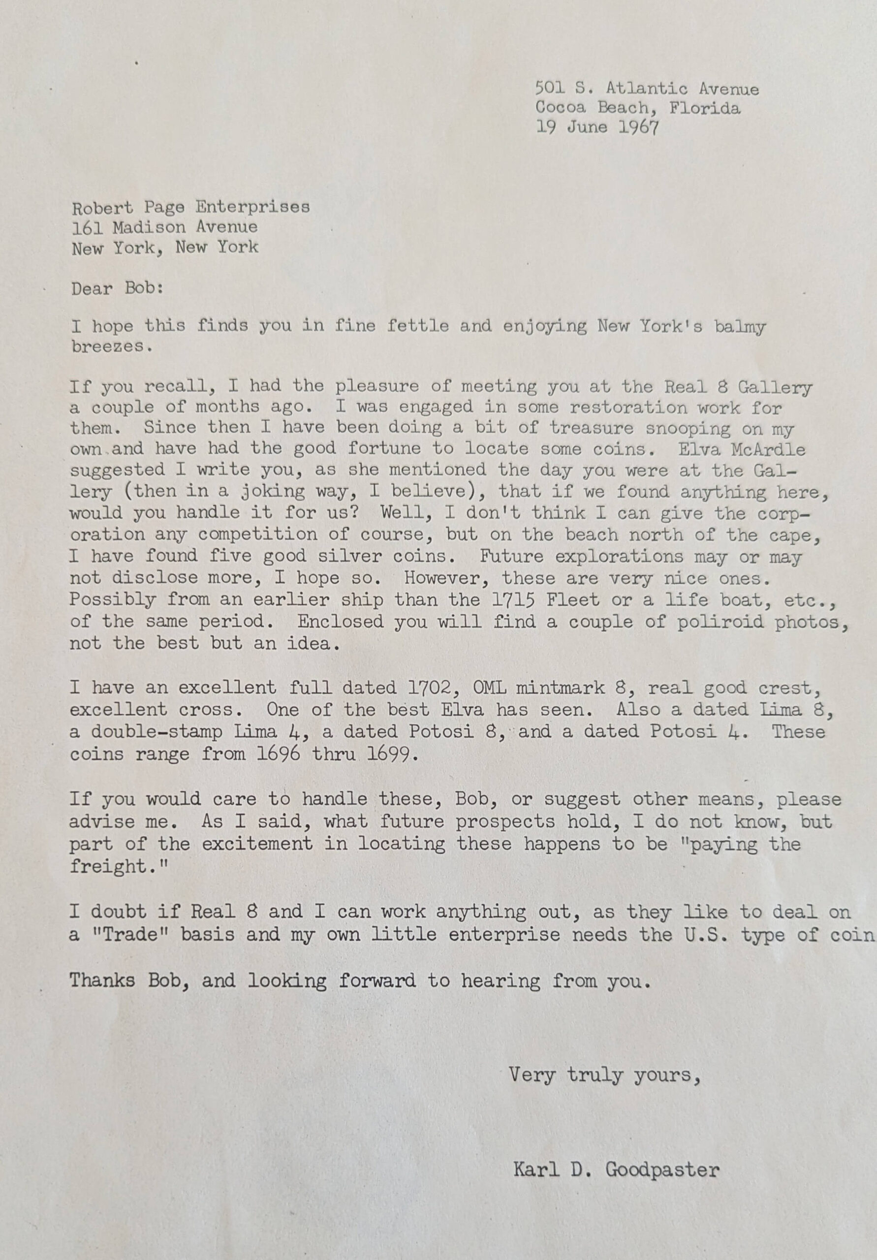 Here is an interesting item (below) that I came across while organizing some Fleet-related archival documents. This letter was written by a gentleman named Karl Goodpaster. He worked for the Real Eight CompanyAlso referred to occasionally as “The Real 8 Company”- was incorporated in 1961. It had eight members….Kip Wagner, Kip Kelso, Dan Thompson, Harry Cannon, Lou Ullian, Del Long, Erv Taylor and Lis... More back in the 1960’s, doing mainly restoration work. He is reaching out to Robert Page, who also did some marketing work for Real Eight. Among other things, the letter mentions Elva McCardle, who worked at the Real Eight Gallery of Sunken Treasure, originally located in a building owned by The First National Bank of Satellite Beach. This was before they moved their museum to Cape Canaveral a few years later. Elva McCardle was the sister of Real Eight member Dan ThompsonDan Thompson (1920 – 2005) Was a diver and original member of the Real Eight Company. Born in Savannah, Georgia, he was an electrical engineer and had a distinguished career in the U.S. Air Forc... More. It should be mentioned that Real Eight Certificates of Authenticity signed by Elva McCardle are quite rare and sought after by collectors.
