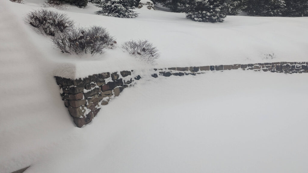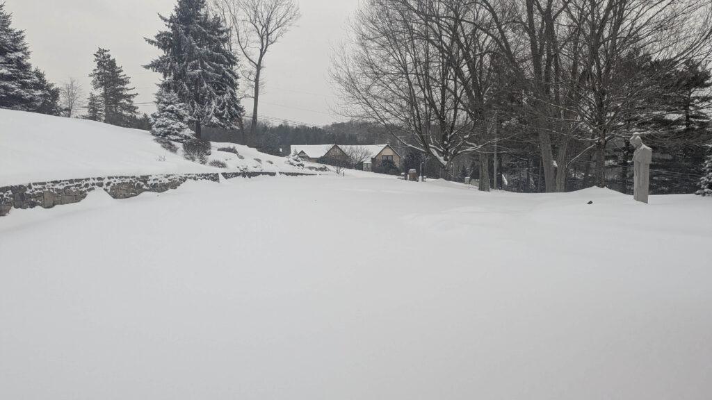 Here are two images of my driveway at 7:30 AM this morning. The wall that you see extends for about 180 feet and is 4 feet high in the first picture and tapers all the way to the end, where it is approximately 2 feet high. As you can see, it is almost completely buried. Just another Monday in Pennsylvania …