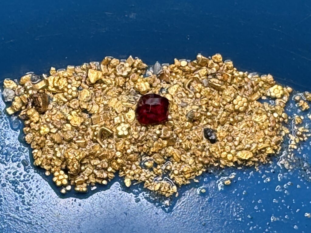 Our featured treasure was found in 2025 at the Corrigan’s Beach wreck site by Sal Guttuso, Director of Operations for 1715 Fleet — Queens Jewels, LLC. Sal, who captained the MV Gold Blooded, found this garnet among gold olive blossom fragments and gold dust (see image). He also found a small garnet at the same location in 2024.