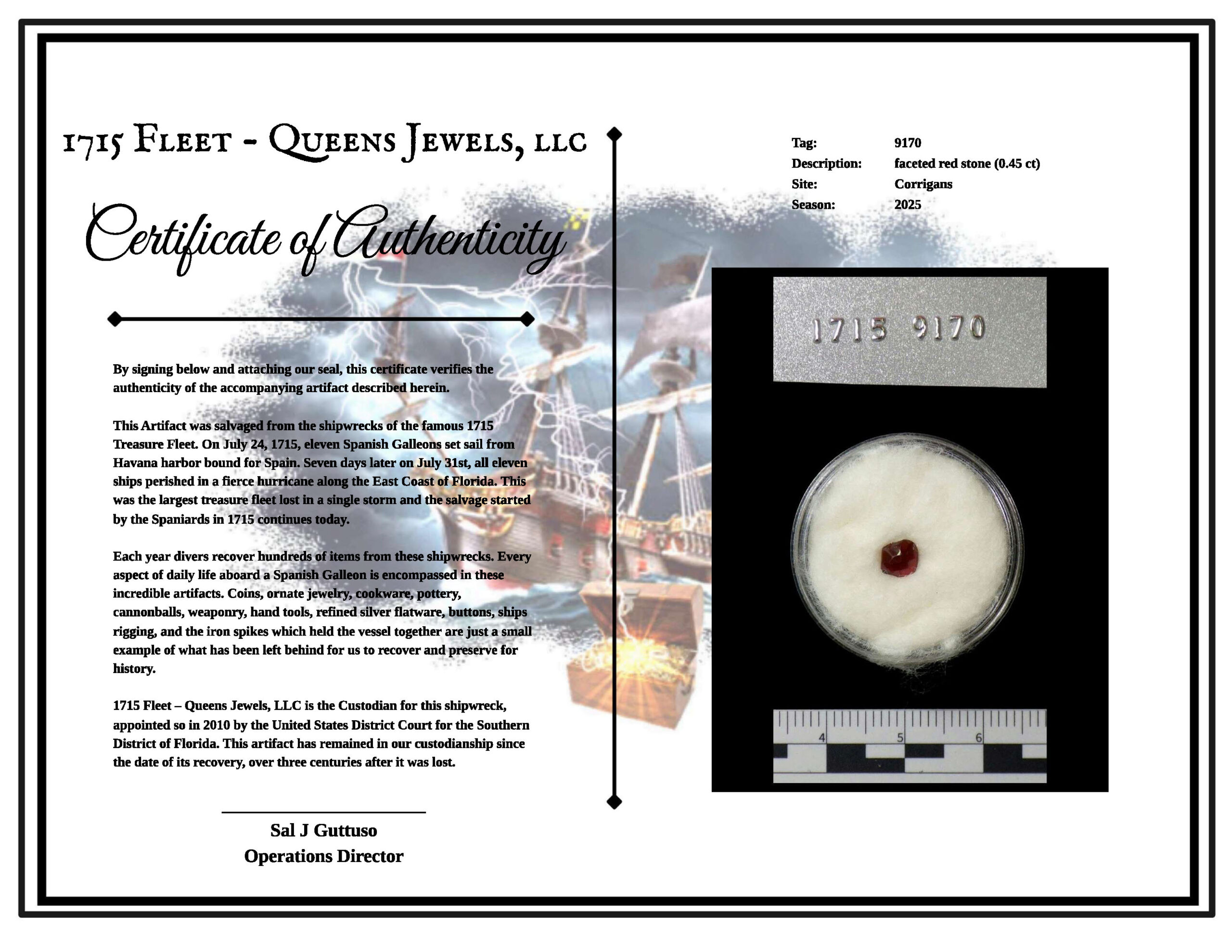 Our featured treasure was found in 2025 at the Corrigan’s Beach wreck site by Sal Guttuso, Director of Operations for 1715 Fleet — Queens Jewels, LLC. Sal, who captained the MV Gold Blooded, found this garnet among gold olive blossom fragments and gold dust (see image). He also found a small garnet at the same location in 2024.