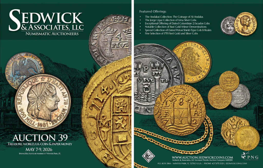 In non-shipwreck cobs, Sedwick & Associates, LLC features several collections and trophies that should not be missed. After a choice run of Mexican Charles-Joanna “Early Series” coinage, they present the next batch from The Jorge Ugaz Collection of Lima silver cobs, following their sale of his 2 reales in a prior auction. The current offering focuses on 8 and 1 reales, carefully assembled over many years with an emphasis on quality, rarity, and important pedigrees from notable prior collections. It begins with some exceptional highlights, including an example of the earliest dollar-sized silver coin struck in South America, the famous Rincón 8 reales. The collection continues with a strong selection from the early Lima mint, featuring multiple varieties, especially from the period of assayer Diego de la Torre. Next are a few special “Star of Lima” issues, followed by a comprehensive run of pillars and waves coinage, with nearly all dates represented and including several very rare round presentation “Royals” (galanos). Comprising over 200 lots, this is one of the largest offerings of Lima cobs Sedwick & Associates, LLC has presented (if not the largest). They follow Lima with a singled-out collection of Potosí dated shield-type 8 reales; watch for several more very rare “Royals” in the regular Potosí cob offering.